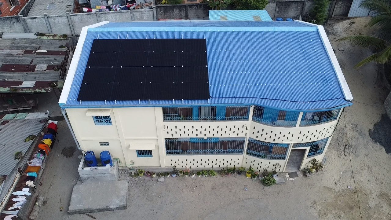 La communauté des Franciscains a financé la construction d’un bâtiment accueillant des enfants abandonnés et douze jeunes mères en situation de précarité. Ce lieu a pour vocation d’offrir un cadre protecteur, éducatif et formateur, afin de permettre aux enfants de grandir dans de bonnes conditions et aux jeunes mères de se former pour accéder à l’emploi et à l’autonomie. Une installation solaire hybride avec stockage de l’énergie fournit l’énergie suffisante pendant la durée de délestage du réseau public.